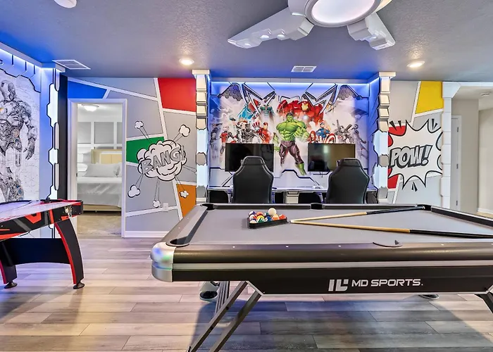 Situada a 4 km de Thompson Aire Air Balloon Rides, la villa New 10 Bedrooms At Windsor Cay Orlando incluye una piscina, bañera de hidromasaje en los que relajarse.